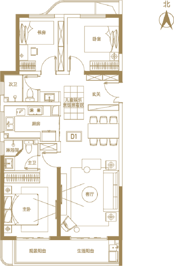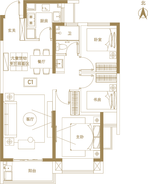 主臥與客廳均朝南,滿足全家人的采光需要;同時(shí)專門設(shè)置了兒童娛樂烹飪照看區(qū),時(shí)刻關(guān)切孩子成長(zhǎng)的每一瞬間。