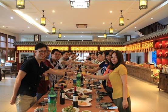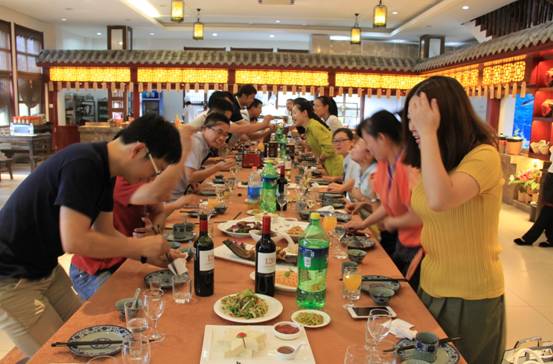 晚餐之前,為了活躍氣氛,人力資源部為大家精心準(zhǔn)備了“筷樂(lè)傳遞”的游戲,長(zhǎng)桌對(duì)面分為兩組進(jìn)行PK,用筷子把乒乓球從頭傳到尾的隊(duì)為勝,獲勝的隊(duì)有項(xiàng)特權(quán)可以讓失敗的隊(duì)為自己夾菜吃。一個(gè)簡(jiǎn)單的游戲讓大家體會(huì)到團(tuán)隊(duì)配合的力量,也讓整個(gè)晚餐的氛圍愉悅起來(lái)。