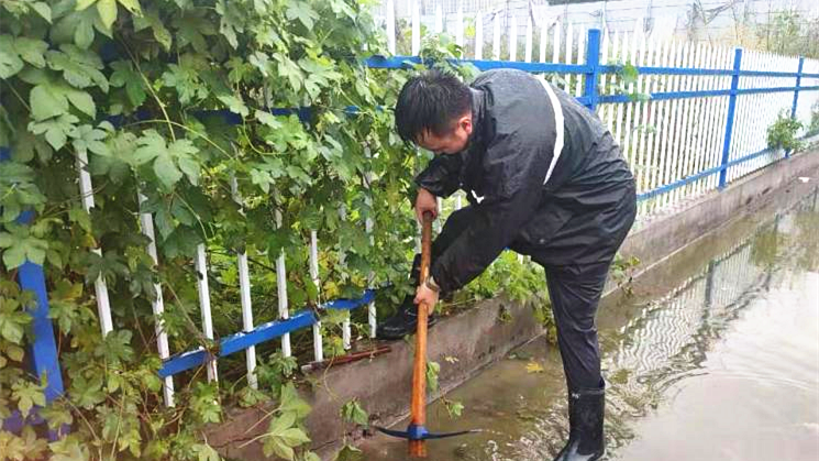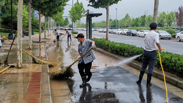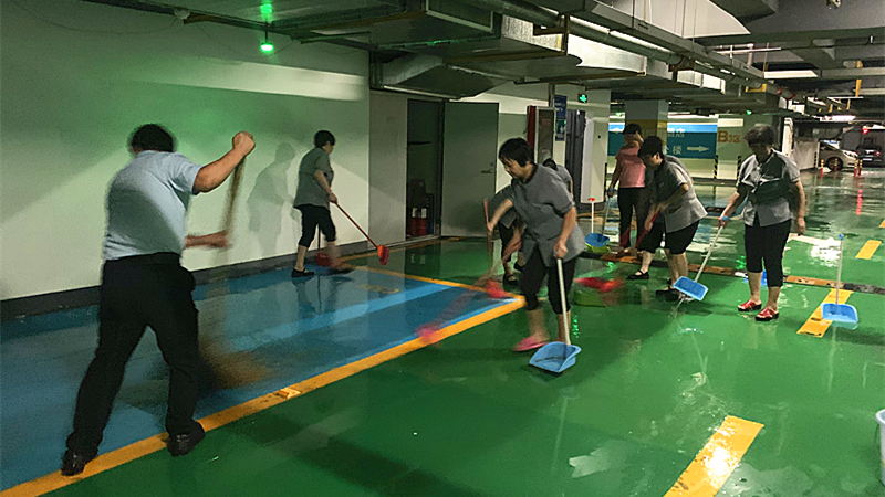 在雨水絲毫不減,越下越急的危機時刻,工程部師傅們毅然踏入水中,一點一點清理被堵的排水口,盡全力保障業(yè)主家園安全。平均年齡比其他各部門都高的環(huán)境部工作人員,絲毫沒拖任何后腿,全力向前,爭分奪秒地不間斷補位吸水排污,順利完成美盛中心地下三層車庫無積水出現(xiàn)任務。