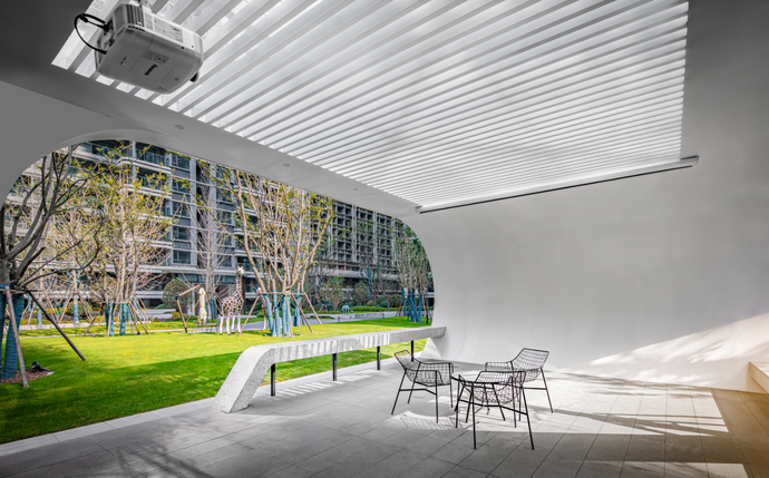 舉目環(huán)顧,飽含設(shè)計(jì)者智慧與巧思的圍合式排列建筑,帶來(lái)開(kāi)闊視野,中心區(qū)域打造景觀大中庭消弭了建筑的壓迫感,充足的戶外空間、起伏有致的坡地景觀,讓開(kāi)闊感與通透感撲面而來(lái)。
