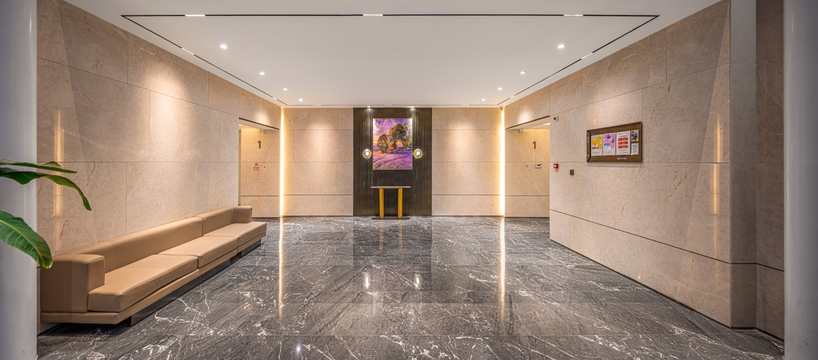 首層單元入戶大堂,同樣以高規(guī)格現(xiàn)代風(fēng)格進(jìn)行精裝,落地玻璃單元大門搭配金屬細(xì)節(jié),呈現(xiàn)明亮、清雅的空間感,大堂空間全鋪設(shè)石材、以藝術(shù)畫(huà)裝點(diǎn),綠植、休息沙發(fā)等也已就位,帶給居者舒適的視覺(jué)享受和品質(zhì)體驗(yàn)。