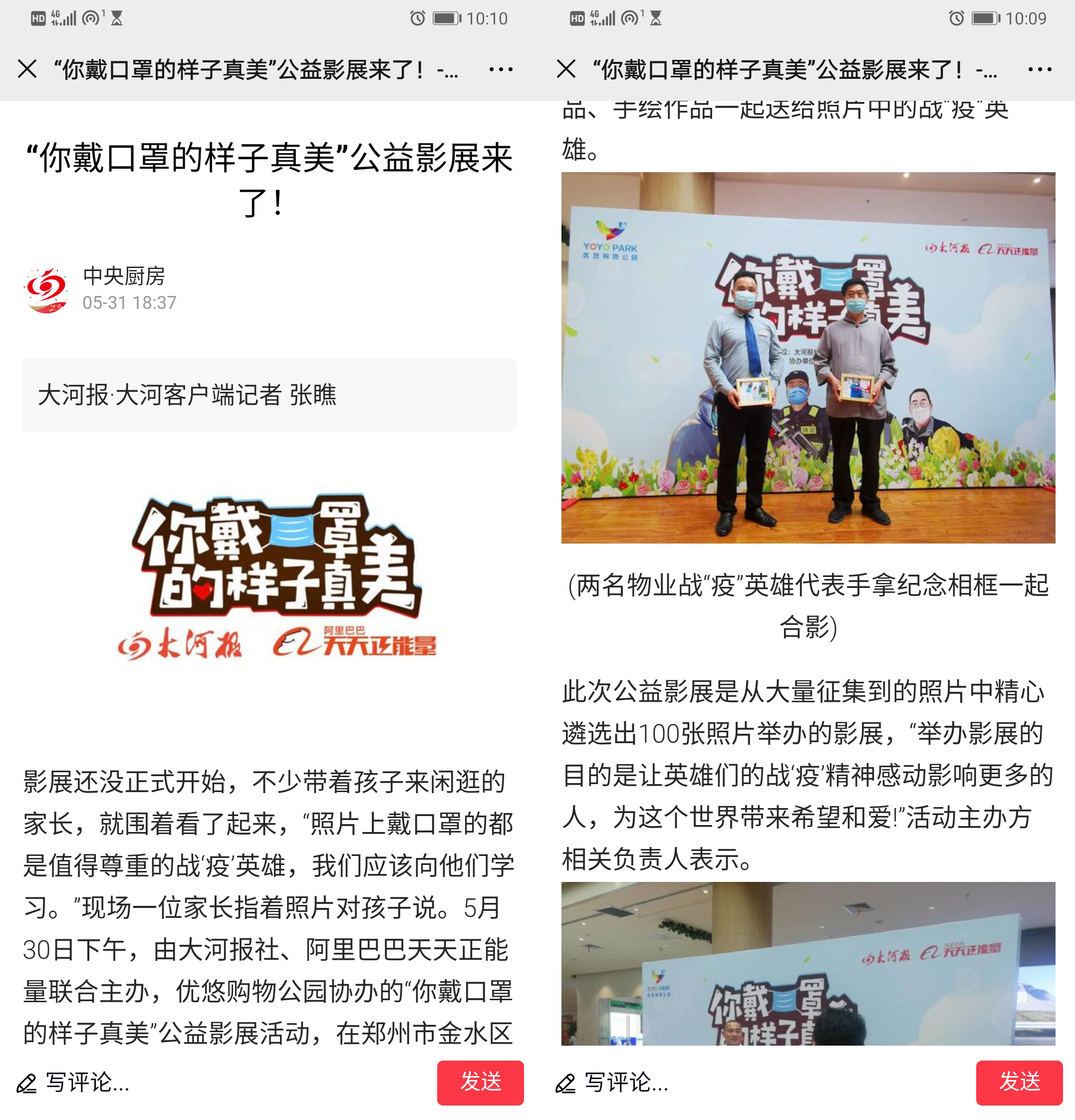 首頁 > 物業(yè)服務(wù) > 物業(yè)新聞5月30日下午,由大河報社、阿里巴巴天天正能量聯(lián)合主辦,優(yōu)悠購物公園協(xié)辦的“你戴口罩的樣子真美”公益影展活動,在鄭州市金水區(qū)國基路與豐慶路交叉口西南角的優(yōu)悠購物公園正式開幕。